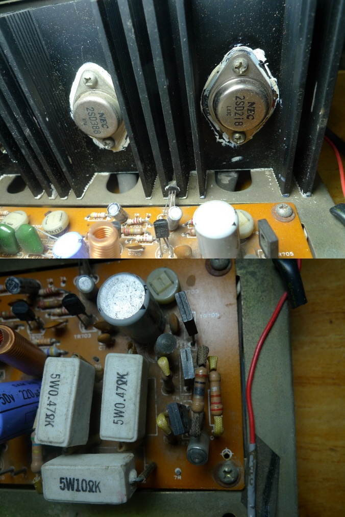 리캡하고 바이어스 조정하다가 그전에 수리된 우측 채널쪽 파워 TR 1개,바이어스 회로 TR도 나갔습니다.